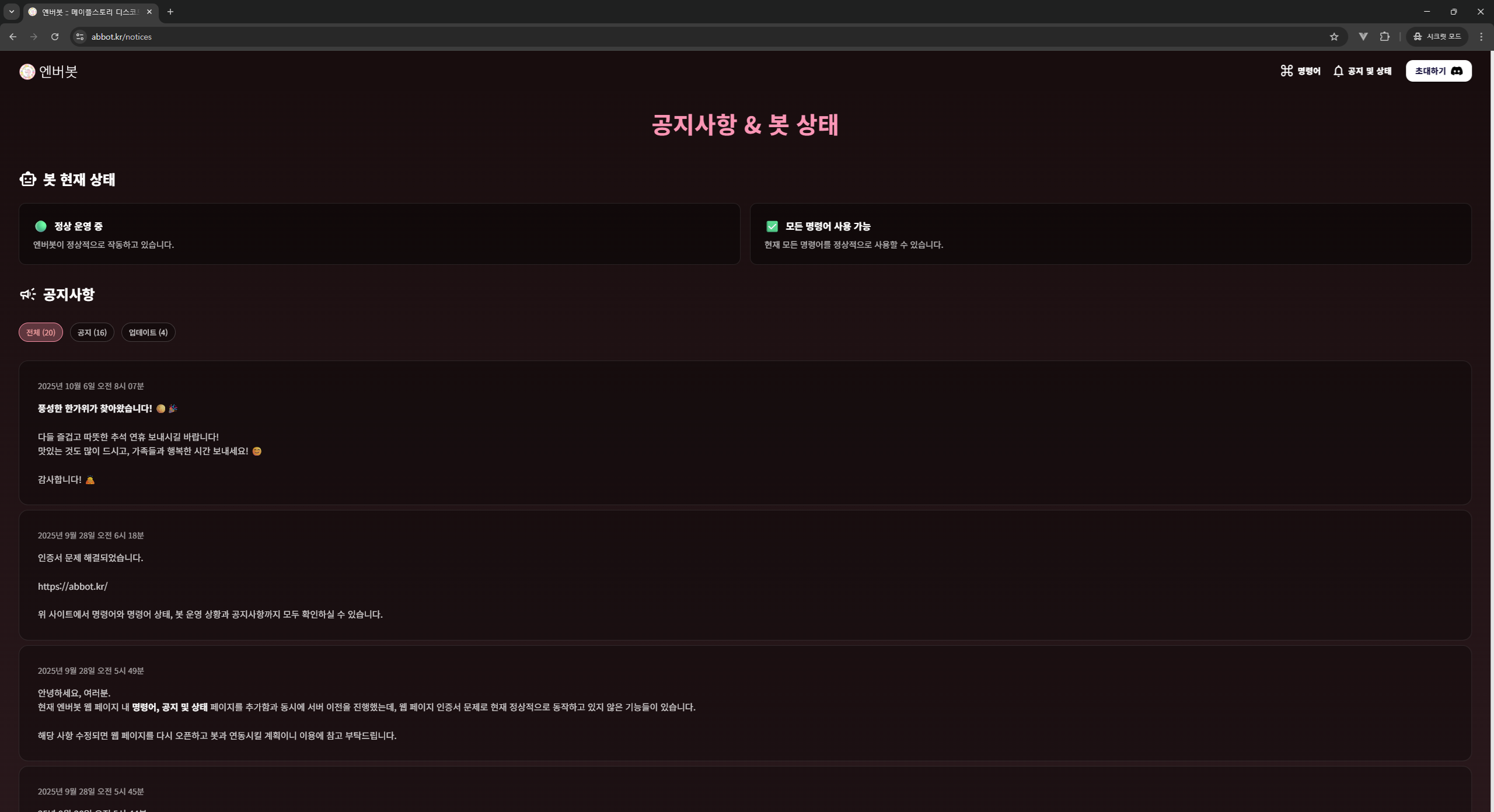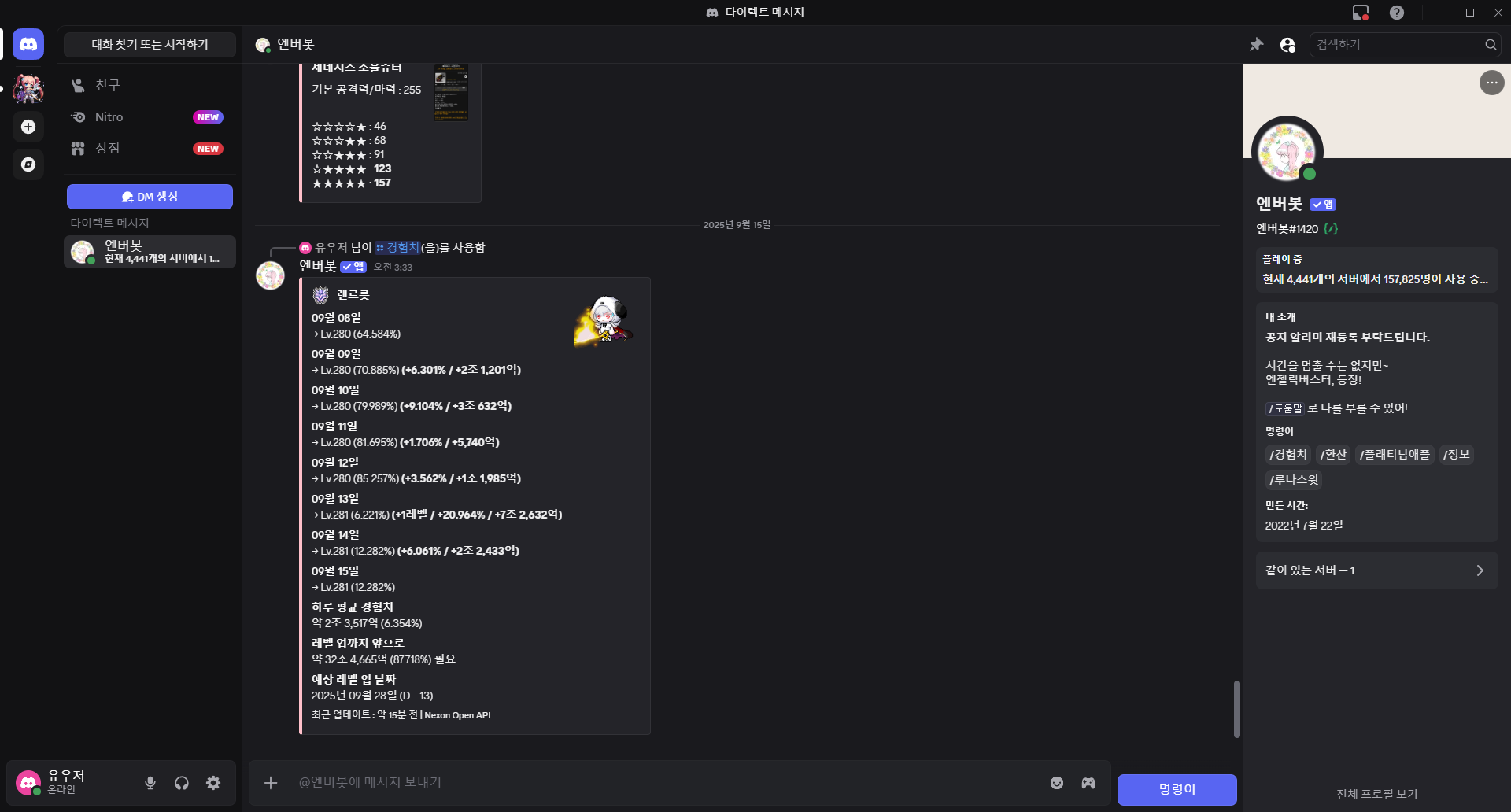 A Discord chatbot that provides MapleStory-related information to users. Utilizes Nexon Open API to deliver real-time game information, character search, and guild details. Has been in service for approximately 3 years, currently serving over 180,000 users across about 4,700 servers.
